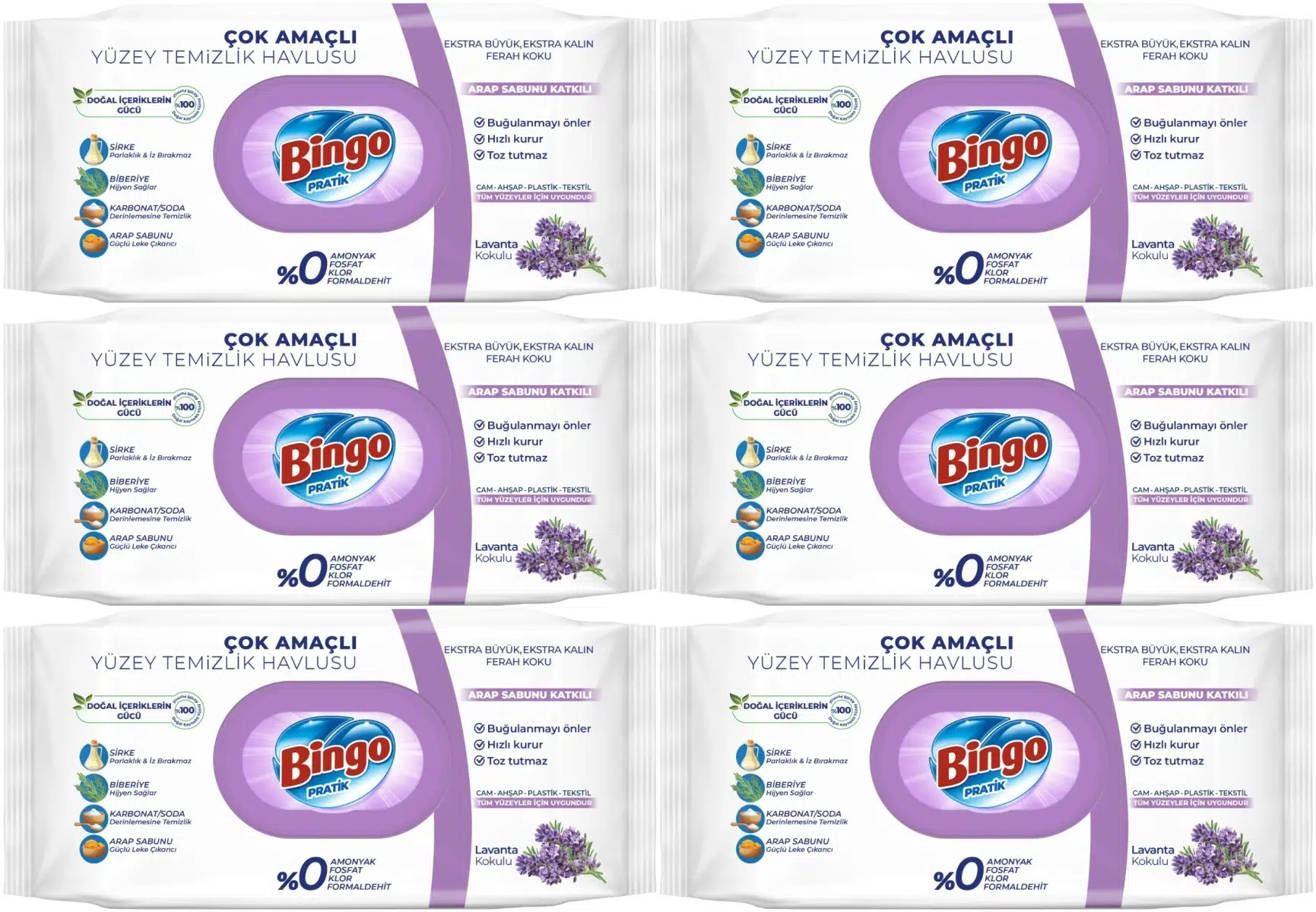 Bingo Clean Yüzey Temizlik Havlusu 96 Yaprak Lavanta Kokulu Plastik Kapaklı (6 Lı Set) 576 Yaprak