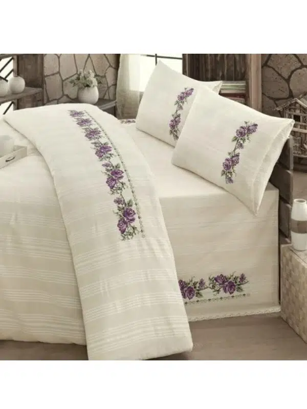 EtiketlerBuldan İşi Kanaviçe Nakışlı Çift Kişilik Nevresim Takımı-Lila