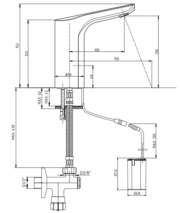 Çıkış Ucu Uzunluğu 100 mm'dir. Çıkış Ucu Yüksekliği 130 mm'dir. Çift Su Girişlidir. 6 V Pil İle Çalışır 3 Bar Basınçta Su Akış Miktarı Dakikada Maksimum 5 Lt " Yurtiçi Ücretsiz Montaj Hizmeti Verilmektedir. Kireç Temizleme Sistemli Perlatör Filtreli Ara Musluk Ürünle Birlikte Verilmektedir