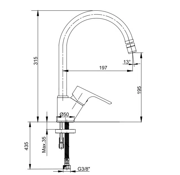 Çıkış Ucu Uzunluğu 197 mm'dir.Çıkış Ucu Uzunluğu 195 mm'dir.3 Bar Basınçta Su Akış Miktarı Dakikada Maksimum 7,6 Lt "ST" Kodlarda İse Dakikada Maksimum 5 Lt'dir.Mafsallı 360° Döner Çıkış Uçlu