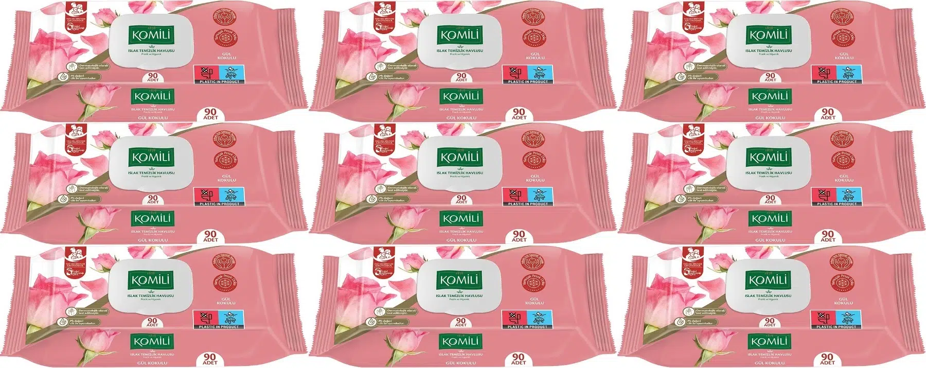 Komili Islak Havlu Mendil 90 Yaprak Gül Kokulu (9 Lu Set) Pratik Kapaklı (810 Yaprak)