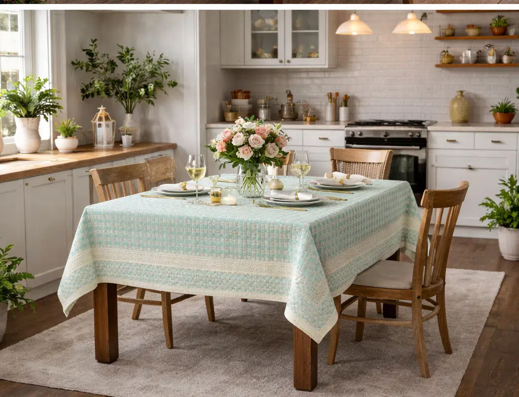 Zarif desenleriyle ve kenar bordür ile süslenmiş, otantik bir görünüm sunan krem/ yeşil rengi masa örtüsü, yemek masanızın şıklığını artırır