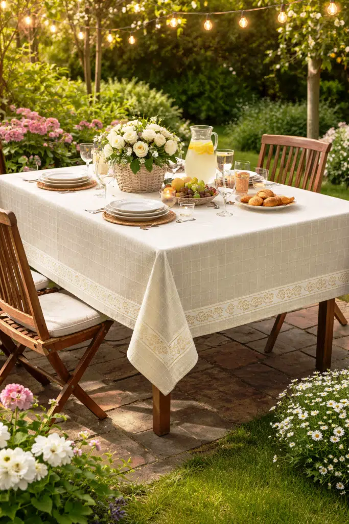 Zarif desenleriyle ve kenar bordür ile süslenmiş, otantik bir görünüm sunan krem rengi masa örtüsü, yemek masanızın şıklığını artırır